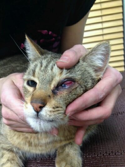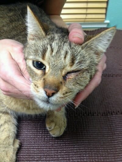 This pet's name is Cobain and as you can see, his left eye is obviously causing discomfort. After being outside for just one day, his owner found him like this. The eye was very swollen and painful. A topical anesthetic was used to numb the eye, then Dr.Stambaugh was able open the eye and under the eyelid there was a foxtail!